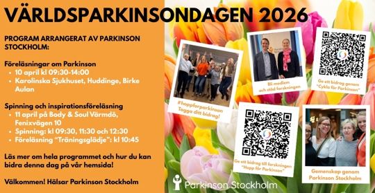 Var med när Världsparkinsondagen uppmärksammas i Stockholm 10-11 april. Du kan delta på föreläsningar på Karolinska Sjukhuset i Huddinge fredagen den 10 april och vara med på spinningsklasser och inspirationsföreläsning lördagen 11 april på Body & Soul på Värmdö.